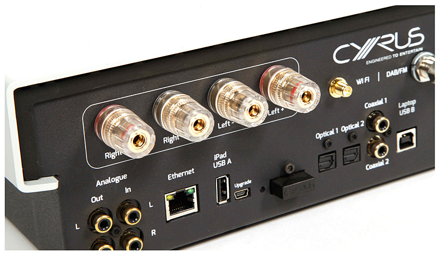 Система оснащена тремя портами USB. Первый (Type A), спрятанный за крышечкой в правом нижнем углу фронтальной панели (вместе с 3,5-мм выходом на наушники), адресован iPhone/iPad (поддерживаются разные версии, от старых до новейших) и внешним накопителям (FAT 16/32); тыловые порты USB предназначены для коммутации с компьютером с использованием 32-битового ЦАПа Cyrus (B) и программного апдейта (mini). Другая цифровая коммутация представлена двумя коаксиальными и оптическими входами (S/PDIF). Достаточно широкий диапазон поддерживаемых форматов аудиофайлов включает WAV, FLAC и AIFF с параметрами вплоть до 24 бит / 192 кГц. Аналоговые интерфейсы представлены линейными входом и выходом, а также выходом на сабвуфер.