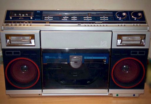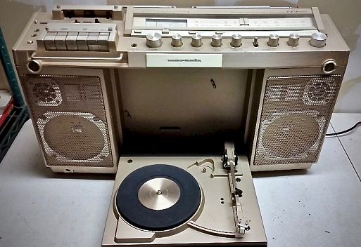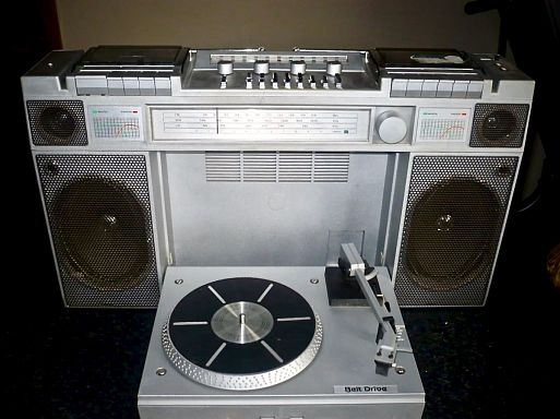 Двухкассетная магнитола с откидной вертушкой. Для автономной работы потребуется 8 батареек. Мощные двухполосные громкоговорители сыграю довольно громко, но качество самой конструкции хромает» - так то, модель находима на аукционах и за 200 евро.