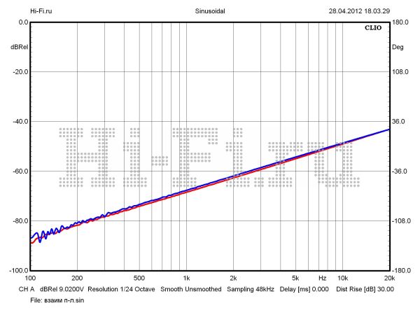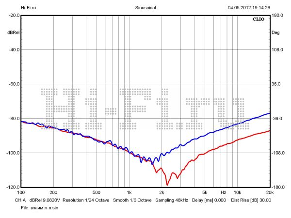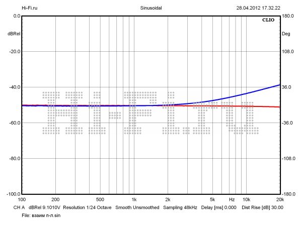 Сразу несколько расчетных характеристик Canor Audio TP106 VR не только оказались лучшими в рамках нашей подборки и даже шире — в целом для усилителей подобной конструкции; некоторые значения вполне могут конкурировать с теми показателями, что свойственны твердотельным усилителям. Это, например, редко встречающиеся у мощника на лампах следующие величины: неравномерность АЧХ в диапазоне звуковых частот 0,05 дБ (рис. 1), отношение сигнал/шум 107 дБА, коэффициент демпфирования 12,5 ед., КНИ 0,036% (на 1 Вт, 1 кГц). Продолжая сравнение, укажем и параметры, по которым аппарат проигрывает другим участникам: максимальная выходная мощность 48 Вт (КНИ 10%), разбалансировка между каналами 0,54 дБ, верхняя граничная частота 55 кГц (10 Вт). Здесь также стоит обратить внимание на малый рост нелинейных искажений с увеличением выходной мощности. Значение этого параметра пересекает барьер в 1% лишь на 40 Вт (рис. 2). Проникновение сигнала между каналами среднее по тесту и составляет не более –48 дБ на 10 кГц (рис. 3).