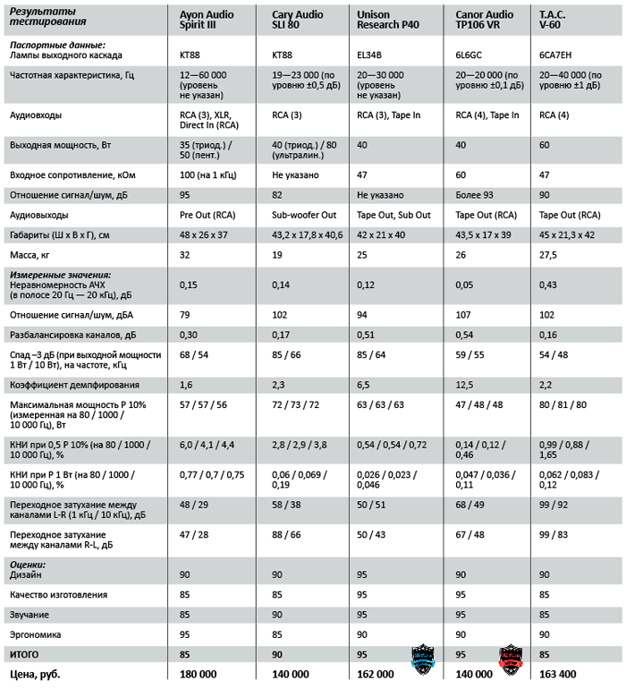 Название – Cary Audio Design SLI 80 | Входное сопротивление, кОм – не указано | Выходная мощность (триодный / ультралинейный режим), Вт – 40 x 2 / 80 х 2 | Частотная характеристика, Гц – 19—23 000 (по уровню ±0,5 дБ) | Гармонические искажения, % – не указаны | Отношение сигнал/шум, дБ – 82 | Аудиовходы – стереопары RCA (3) | Аудиовыход – Subwoofer Out (2 х RCA) | Энергопотребление (максимальное), Вт – 166 | Габариты, см – 43,2 x 17,8 x 40,6 | Масса, кг – 19