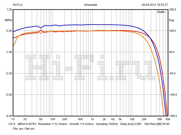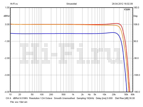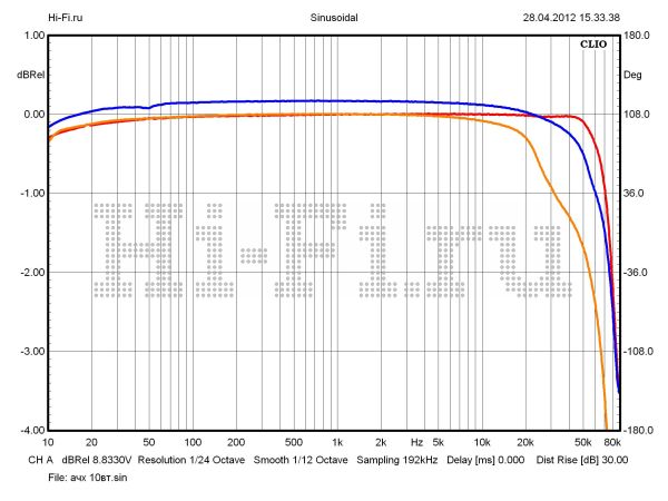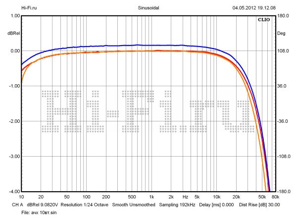 Усилитель Ayon Audio Spirit III, пожалуй, лучше всех в нашем тесте может удовлетворить потребности любителей лампового звука, если рассматривать полученные характеристики с позиции индивидуального почерка компонента. Привнесенные искажения различного рода, безусловно, будут хорошо различимы и «обогатят исходный спектр сигнала теплыми ламповыми интонациями». Значения КНИ пересекают планку в 1% при выходной мощности 2 Вт. При 10% искажений усилитель выдает мощность 57 Вт на нагрузку 8 Ом (рис. 2). Частотная характеристика стабильна. Неравномерность в полосе звуковых частот не более 0,15 дБ (рис. 1). Этот параметр сильно зависит от колебаний импеданса акустики — коэффициент демпфирования составляет всего 1,6. Верхняя граничная частота равна 68 кГц (–3 дБ, 1 Вт) и при увеличении громкости снижается незначительно (оранжевый граф — 10 Вт). Разбаланс сигнала между каналами совсем небольшой (0,3 дБ), а вот взаимопроникновение между ними будет слышно — ослабление менее 30 дБ на 10 кГц (рис. 3).