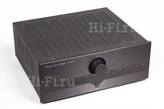 В усилителе установлены четыре выходных лампы 6L6GC, вместо отобранных и предварительно тренированных 6550 у VR+. «Плюсовая» версия выдавала 55 Вт на канал, причем до первых 20 Вт работала в классе А, а этот аппарат обеспечивает 40 Вт на канал с первыми 10 Вт в классе А. Тороидальный трансформатор в блоке питания TP 106 VR с сердечником, пропитанным в вакуумной камере, идентичен примененному в старшей модели. Помимо наличия экранирующего металлического короба, первичная и вторичные обмотки у него изолированы также друг от друга медной фольгой. Для регулирования напряжения входного и оконечного каскадов используются отдельные обмотки, однако в «плюсовом» устройстве лампы подключались к ним через высококачественные Mundorf MCap ZN, а в нашем участнике стоят конденсаторы менее именитого производителя. Ниже и цена усилителя — более чем на тридцать тысяч рублей. Все лампы внутри — саратовские. В предусилительном каскаде задействованы четыре триода 12AT7, в выходном — упомянутые выше четыре лучевых тетрода 6L6GC в ультралинейном включении. Выходные трансформаторы с секционированными бифилярными обмотками имеют катодные отводы от первичной обмотки для организации умеренной ООС. За анодное питание тетродов отвечает пара кенотронов Sovtek 5AR4.