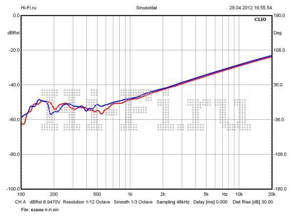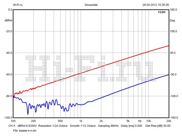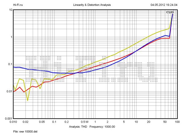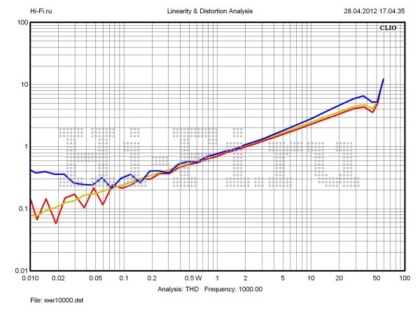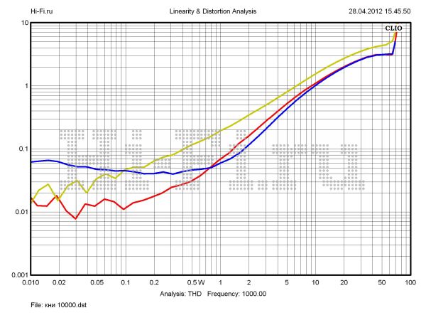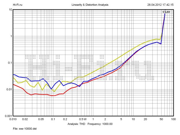 T.A.C. V-60 дал нам целых три рекордных показателя в рамках теста. Во-первых, он лидирует по максимальной звуковой мощности. Значение этого параметра равно 81 Вт при 10% нелинейных искажений. Кроме того, здесь мы имеем минимальный разбаланс каналов — 0,16 дБ (рис. 1) и превосходное экранирование между ними — 83 дБ на 10 кГц (рис. 3). Отметим еще один положительный момент. Рост нелинейных искажений очень умеренный. Усилитель работает в пределах 1% КНИ в широком диапазоне выходных мощностей, вплоть до 65 Вт на средних частотах (рис. 2). Шумовая планка расположена достаточно низко относительно уровня полезного сигнала — 102 дБА. Хуже своих соперников аппарат проявил себя в вопросах неравномерности АЧХ в диапазоне слышимых частот (0,43 дБ) и ширины полосы пропускания. Верхняя граничная частота при выходной мощности 10 Вт составила 48 кГц. Демпинг-фактор маловат — 2,2 ед.
