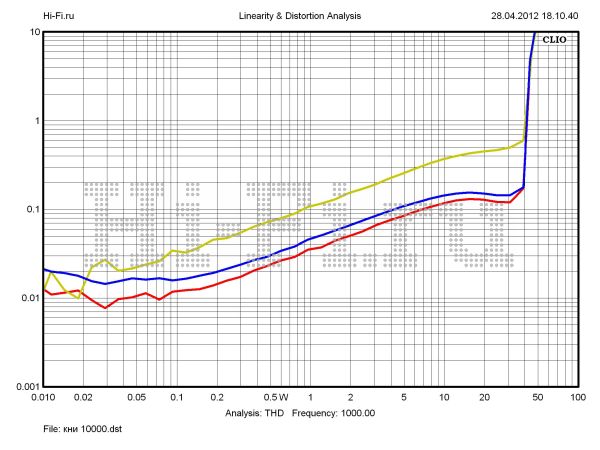 Усилитель Unison Research P40 продемонстрировал очень сбалансированные характеристики. Имея всего лишь один рекордный показатель в тесте — коэффициент нелинейных искажений при выходной мощности 1 Вт (0,023%), остальные он удерживает на уровне не ниже средних значений по тесту. Частотная характеристика стабильна. Неравномерность в полосе звуковых частот не более 0,12 дБ. Спад по уровню –3 дБ обнаруживается на 85 кГц (рис. 1). Коэффициент демпфирования равен 6,5 ед. — весьма неплохая величина для лампового усилителя. Максимальная выходная мощность на нагрузку 8 Ом составляет 63 Вт, причем 1% нелинейных искажений выбирается лишь при мощности 50 Вт (рис. 2). Интересно ведут себя графики взаимопроникновения сигнала между каналами (рис. 3). Ослабление стабильное во всем диапазоне частот и для 10 кГц соответствует 43 дБ в худшем варианте. Отношение сигнал/шум не очень большое, но достаточное — 94 дБА.