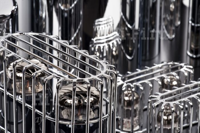 Четверка выходных KT88sx тоже заказная. Эти лампы эффектно называются Black Treasure и от серийных отличаются несколько иными техническими параметрами, золотыми сетками и полимерным покрытием стекла ламп, поглощающим внутреннее отражение от стеклянной колбы. Четыре драйверных двойных триода 12AU7, по два на канал, — российского производства, Tung-Sol. Опция установки, автокалибровки и дальнейшей автоматической поддержки значения тока смещения (для возможности использования других выходных ламп) доступна с помощью пятипозиционного переключателя Bias-ref. В заводской позиции номер 3 она отвечает стандартному набору КТ88.