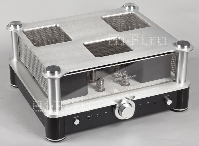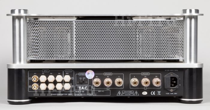 Стало уже довольно привычным, что компания Vincent (и на тесно связанную с ней T.A.C. это правило тоже можно распространить без особых натяжек) отличается особыми взглядами на дизайн компонентов — о нем можно спорить, но внешность ее аппаратов как минимум запоминается. Данный случай не исключение. Третий усилитель в тесте, после Unison Research P40 и Canor Audio TP106 VR, снова предлагает концепцию, противоположную отмеченной у Cary Audio. Насколько SLI 80 был «весь снаружи», настолько же три первые фирмы стремятся спрятать все внутрь, либо в совсем цельный корпус, либо под верхние съемные кожухи, но тоже полностью накрывающие всю начинку и исключающие даже возможность случайного прикосновения к лампам. T.A.C. предложила свое решение — двухэтажную конструкцию а-ля «беседка в стиле классицизма»: с нижней цельноалюминиевой частью-фундаментом и верхней легкой «колоннадой» — четырьмя высокими цилиндрическими ножками, на которые опирается верхняя толстая алюминиевая панель с тремя квадратными окнами над группами ламп. Бока и тыл «беседки», как и прорези сверху, сплошь затянуты мелкой стальной сеткой. Передняя панель из прозрачного акрила несет на себе выгравированное лого фирмы, подсвечиваемое торцевыми светодиодами, — старый фокус, все еще не утративший оригинальности.