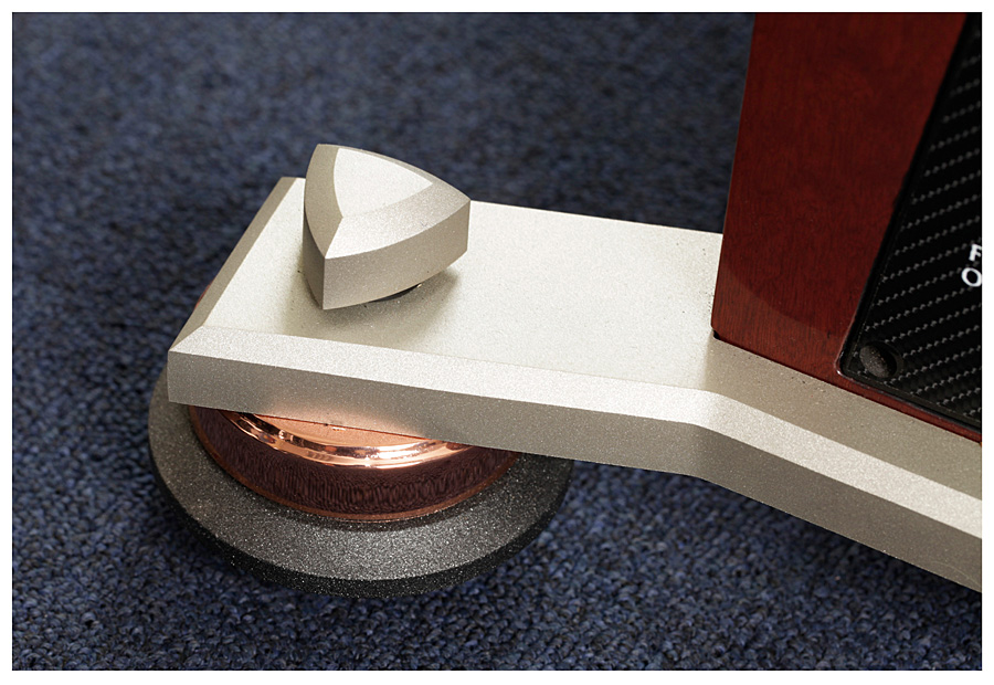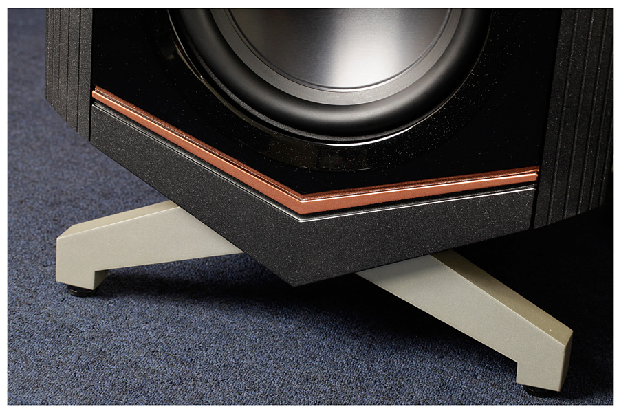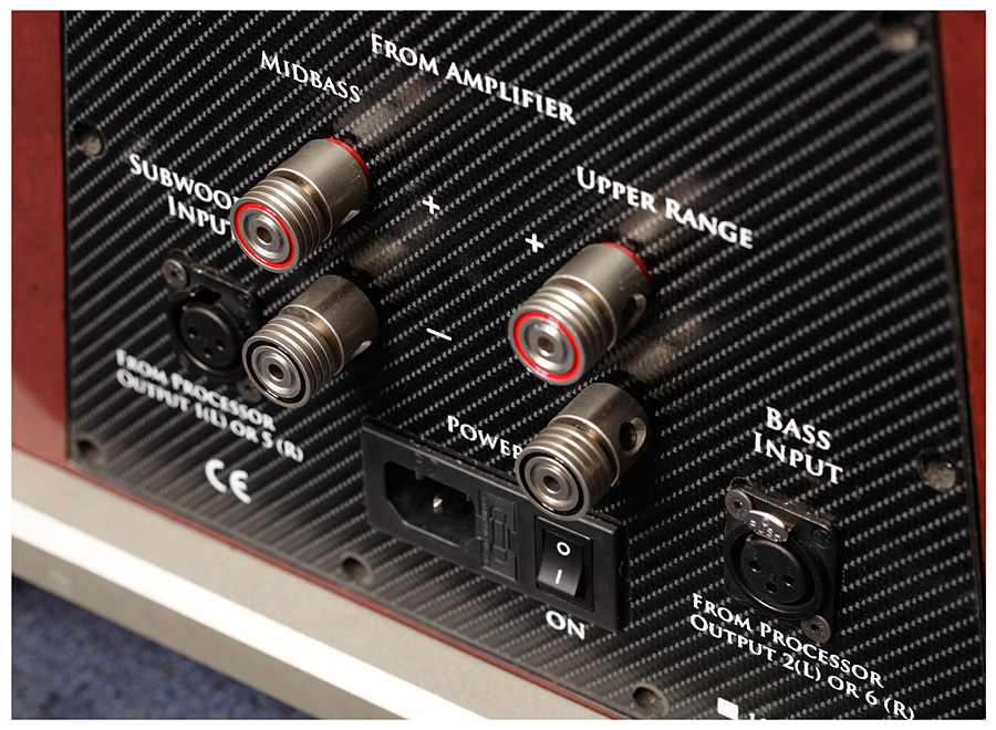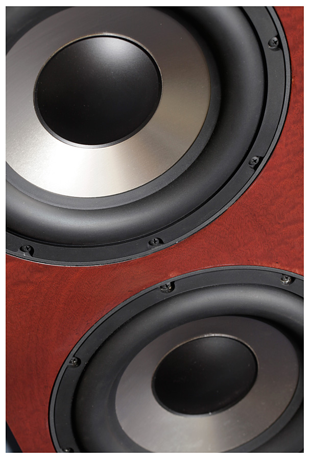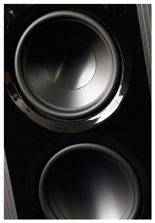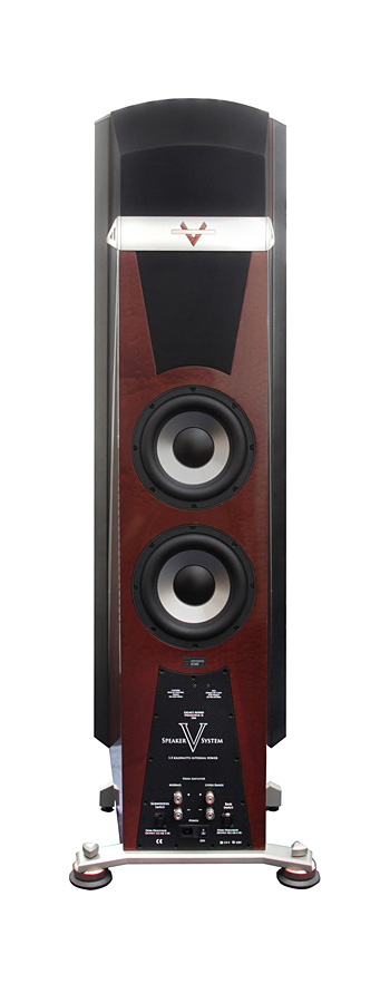 Второй по важности момент – акустическое оформление колонок. На высокие частоты здесь работает два 4" AMT-твитера. Среднечастотная секция оформлена по принципу «открытый ящик» и оснащена двумя 6" и двумя 14" (!) драйверами (в дипольной конфигурации) из углеродно-бумажного композита. На бас работают два динамика – один алюминиевый 12" в закрытом корпусе и еще один такой же 12", нагруженный на три 10" пассивных радиатора. Магниты всех драйверов неодимовые. Басовая секция усилена встроенной системой D-класса (IcePower) суммарной мощностью 3 000 (1 000 + 500 на каждую АС) Вт, для усиления остальных полос понадобится еще два стереофонических или четыре монофонических усилителя (коммутируемых на Wavelet-процессор) мощностью от 30 Вт. Амплитудно-частотная характеристика V заявлена от 16 до 30 000 Гц, рост колонок 1,85м, масса каждой – 103 кг. Частоты раздела кроссовера – 80, 400 и 3 000 Гц. Сопротивление – 4 Ома, чувствительность - 98 дБ.