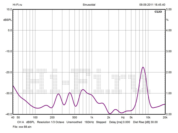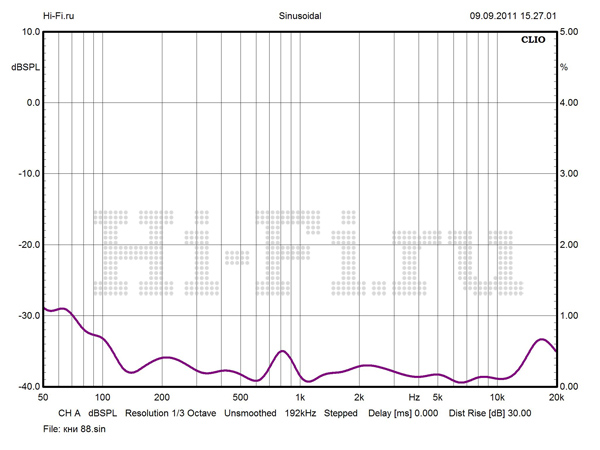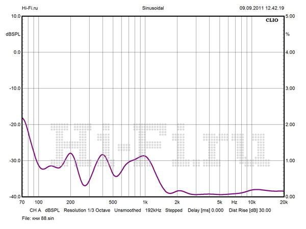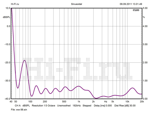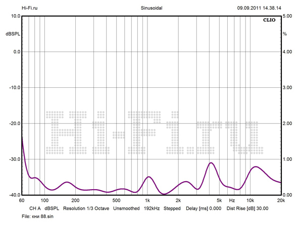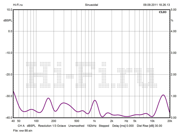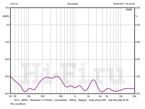 График АЧХ на оси ведет себя весьма неспокойно, с неравномерностью, не укладывающейся даже в коридор 5 дБ выше 3 кГц (рис. 1). Но при развороте АС от слушателя ситуация стабилизируется, частотный диапазон разделяется на две зоны со ступенчатым переходом и исчезающе малыми флуктуациями внутри каждой зоны. Нижняя граничная частота по –10 дБ составляет 34 Гц. Модуль импеданса не обнаруживает большого разброса значений (рис. 2). Однако Vienna Acoustics Beethoven Baby Grand не назовешь легкой нагрузкой для усилителя. Импеданс на НЧ в целом заметно ниже среднего (6 Ом, для широкой полосы частот от нижней середины). Кроме минимума в 2,3 Ом на 100 Гц, имеется потенциально проблемная зона в нижнем басу, в районе 33 Гц. КНИ в ВЧ-области пренебрежимо мал, чего не скажешь об НЧ. При 88 dBSPL максимум искажений приходится на 1 кГц — 0,69%, хотя среднее значение составляет всего 0,35% (рис. 3).