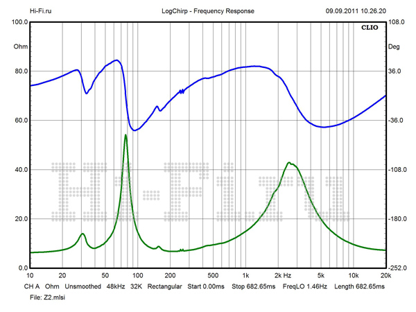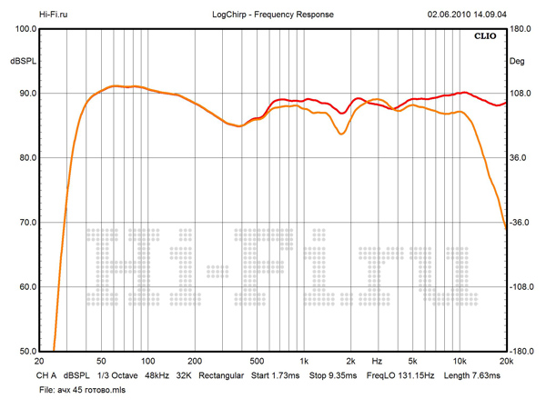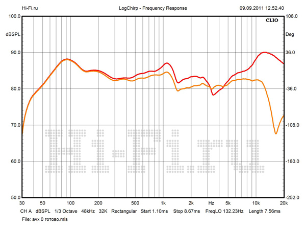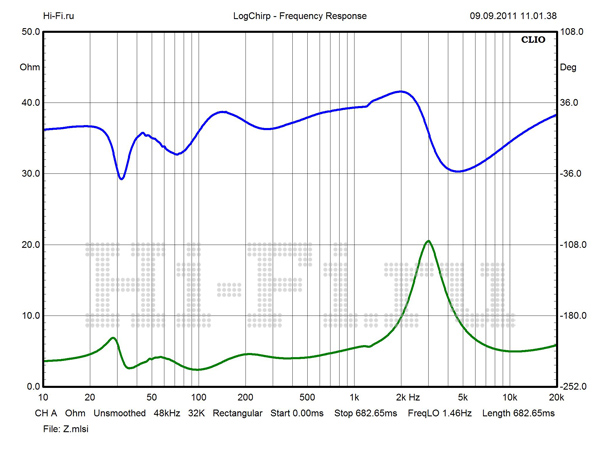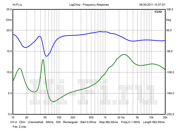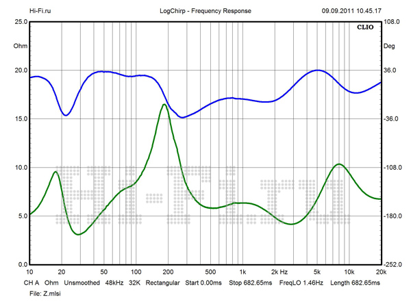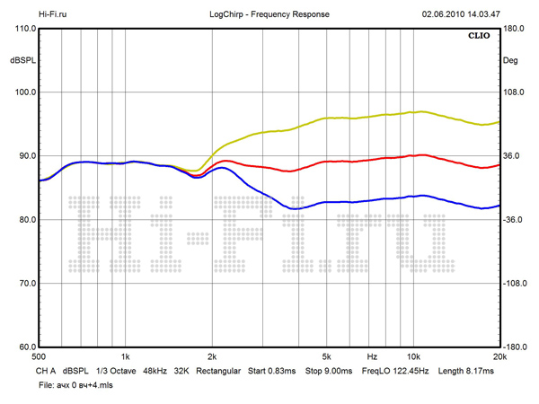 Значения модуля импеданса имеют крайне малый разброс во всей рабочей полосе частот (рис. 2). В диапазонах СЧ и ВЧ перепад минимален и не превышает 5 Ом. Столь же стабильна и фаза. Минимум в 2,6 Ом не опасен, так как нагрузка в этой области имеет резистивный характер. Полной противоположностью является поведение АЧХ. При стандартной установке измерительного микрофона на расстоянии 1 м на оси ВЧ-излучателя картина выглядит удручающе (рис. 1). Наиболее проблемная область — от 500 Гц до 3 кГц. Пробуя различные варианты с взаимным расположением источника и приемника, мы смогли сузить эту область и уменьшить провал на стыке средних и высоких частот, но неравномерность все равно осталась высокой. Причину мы видим в работе разделительных фильтров. Решением может стать подключение в режиме биампинга с использованием внешнего кроссовера с частотой раздела в районе 500—600 Гц.