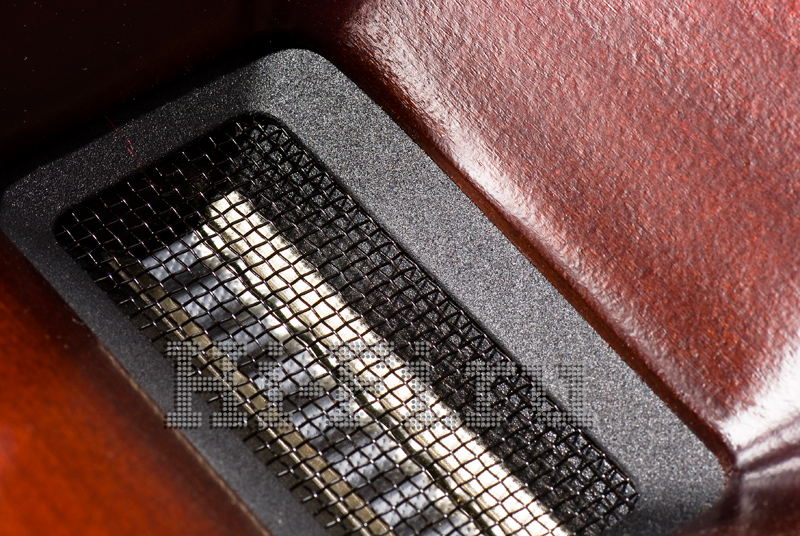Penaudio — еще одна фирма, неизменно предпочитающая продукцию SEAS для своих акустических систем. В модели Serenade установлены специально доработанные излучатели SEAS Exel на ВЧ и СЧ, обладающие широкой рабочей полосой частот. Шелковый купол твитера управляется намотанной серебром катушкой с ферромагнитной охлаждающей жидкостью в зазоре. Алюминиевые длинноходные НЧ-динамики с четырехслойными катушками расположены на боковых стенках корпусов. Внутренняя разводка осуществлена медным проводом, в фильтрах (1-й порядок на СЧ и 3-й на ВЧ) используются полипропиленовые конденсаторы и медные фольговые катушки индуктивности. Динамики по отдельности прикрыты круглыми стальными сетками грилей, снимающимися с некоторым трудом. Сзади имеются одна пара клемм WBT и два маленьких порта фазоинвертора, один напротив твитера, а второй практически в самом низу, рядом с клеммником. Длинные трубы фазоинверторов сделаны из шлифованного алюминия. Высокие и узкие напольники со стороны смотрятся как-то неустойчиво, и это впечатление дополнительно усиливается еще более узкими пьедесталами высотой в несколько сантиметров. Однако корпуса колонок, изготовленные из высококачественной березовой фанеры толщиной 19 мм (еще одна фирменная черта Penaudio), заглушены очень основательно и покоятся на двойном сэндвиче широкого постамента. Заканчивается конструкция длинными острыми шипами. Виброизоляционные основания, красивый шпон «черный ясень» с муаровым рисунком и отличные клеммы недвусмысленно свидетельствуют о высоком ранге этих акустических систем.
