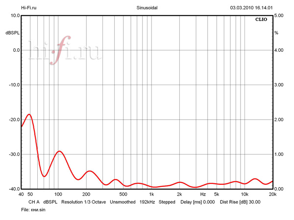 По нижней кривой АЧХ, снятой на 45° относительно оси твитера, можно также судить о практически полном отсутствии направленности излучения в горизонтальной плоскости. Повторяемость характера осевой и неосевой АЧХ близка к идеальной. Избыток НЧ в области средневерхнего баса, примерно 3—4 дБ, частично обусловлен алгоритмом измерения (артефакт измерений в ближнем поле и последующей сшивки), а частично присутствует в действительности, хотя на слух это не воспринимается как бубнение или отчетливое доминирование нижних частот. Значение КНИ (рис. 4) оказалось примечательно малым практически во всем диапазоне (средний КНИ равен 0,2% в частотном интервале 100—10 000 Гц и 0,06% на 1 кГц).