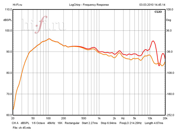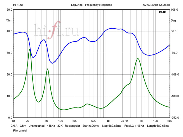 Измеренная величина чувствительности оказалась близкой к декларируемой производителем — 90 дБ. Для номинального сопротивления заявлено значение 6 Ом, хотя по данным измерений акустика скорее 4-омная. Фазоинвертор настроен на частоту примерно 34 Гц. В целом характер импеданса не демонстрирует ничего криминального, однако в области среднего баса имеется неприятное сочетание достаточно низкого значения модуля импеданса и большой отрицательной фазы (4,3 Ом и приблизительно –50°, в районе 90 Гц; см. рис. 1). Положительным же моментом является то, что в области высоких частот сопротивление не падает ниже номинального уровня.