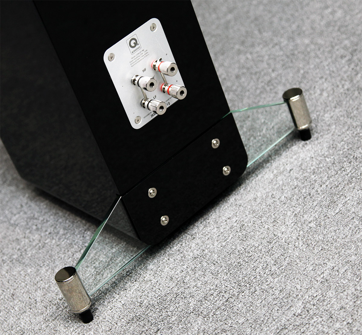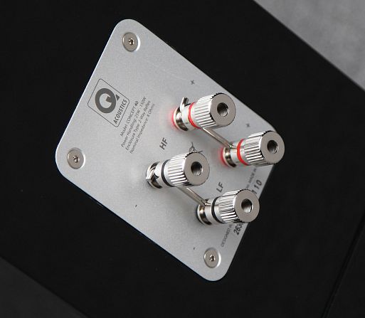 Акустика имеет двухполосную конструкцию с фазоинверсным оформлением. Высокочастотный динамик с 25-мм мягким куполом, используемый в Concept 40, также имеет дополнительную механическую развязку от передней панели. На басу работают два динамика диаметром 125 мм, в отличие от драйверов, применяемых в младших сериях акустики Q Acoustics, в них использована иная центрирующая шайба и увеличенная магнитная система. Частота раздела полос установлена на 2,3 кГц, в кроссовере используются фильтры 4-го порядка. Порт фазоинвертора выведен на заднюю панель и расположен примерно в её центре, блок клемм для акустических проводов допускает двухкабельное подключение. Дополнительную устойчивость всей конструкции придают находящиеся в нижней части корпуса вертикальные стеклянные «крылья» с закрепленными по краям шипами – деталь, оживляющая дизайн Concept 40, и одновременно решающая практическую задачу. Третья опора расположена ровно по центру передней панели. Чувствительность системы заявлена на уровне 90 дБ, номинальное сопротивление – 8 Ом, минимальное значение импеданса – 4 Ома. Весит каждая колонка 18,5 килограммов.