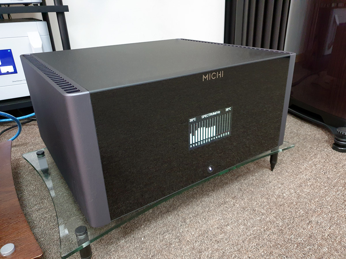 Несколько слов о конструкции моноблока Michi M8, которая, по сути, не сильно отличается от таковой его стереофонического собрата. Практически тот же вес в 59 килограммов, те же два огромных фирменных тороидальных трансформатора на 2 200 ВА и четыре конденсатора британского производства в блоке питания, та же стеклянная передняя панель с жидкокристаллическим дисплеем. На последнем отображается уровень выходного сигнала на шестнадцатиполосном спектральном анализаторе, а также температура транзисторов выходных каскадов.