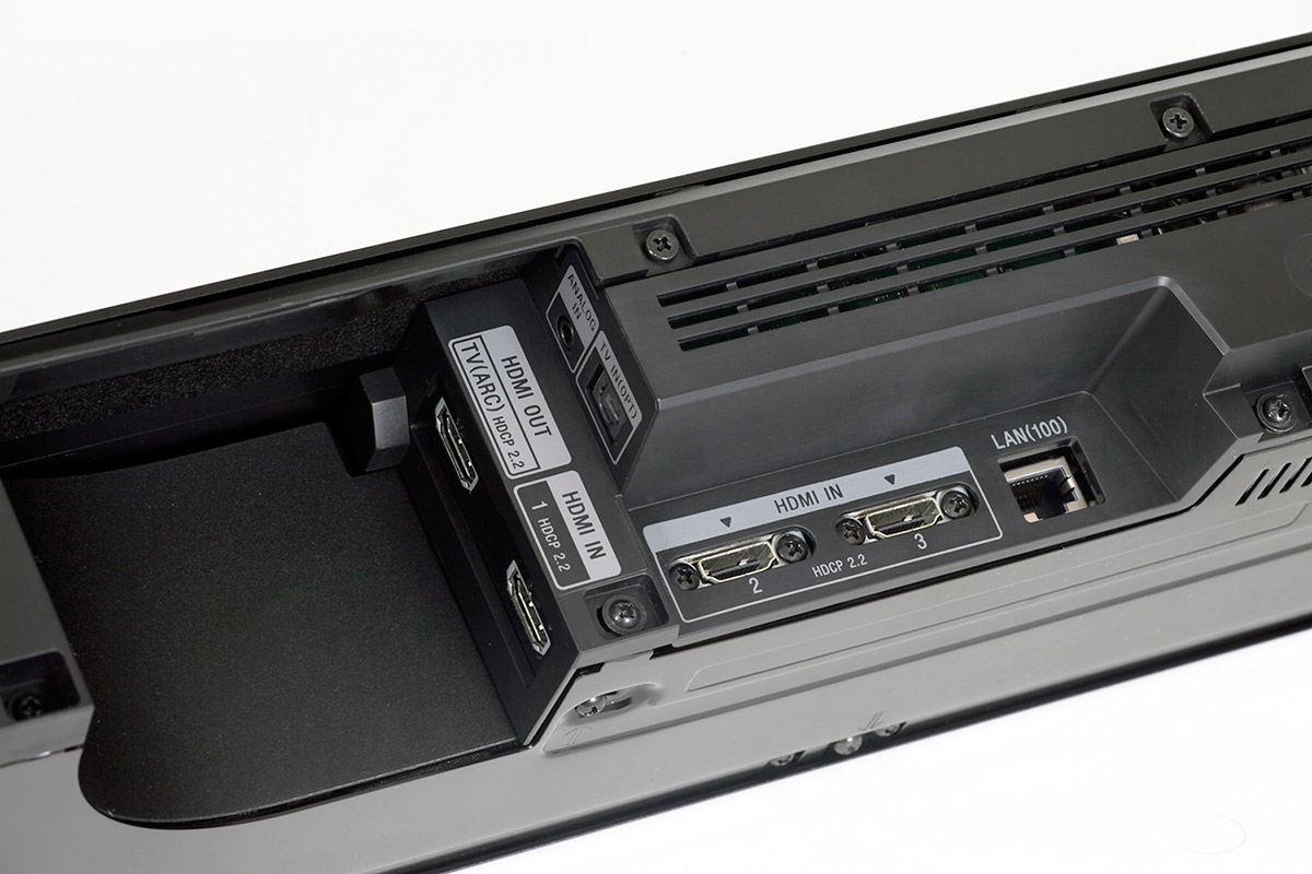 Саундбар оснащен тремя портами HDMI версии 2.0, кабель для подключения вложен в коробку. Как и во всех остальных рассматриваемых моделях, видеотракт уверенно справляется с передачей видео формата 4К с HDR. Выход HDMI совместим с ARC (Audio Return Channel), на задней стенке также есть аналоговый аудиовход на разъеме миниджек, оптический цифровой вход и порт USB для подключения флешек с мультимедийными файлами. Встроенный проигрыватель воспроизводит только аудиофайлы, как с накопителей USB, так и с сетевых серверов. Cпектр совместимых форматов достаточно широк - от MP3 до FLAC и даже DSD. О солидности конструкции свидетельствует и вес компонентов – сам саундбар весит 8,2 килограмма, а сабвуфер тянет на 14,1 кг.
