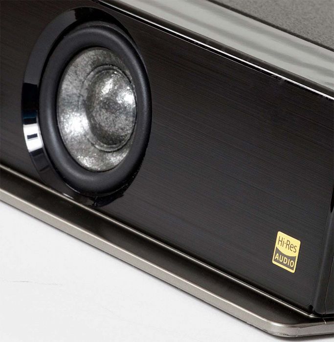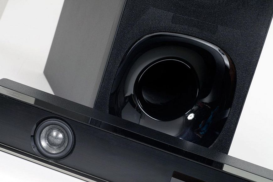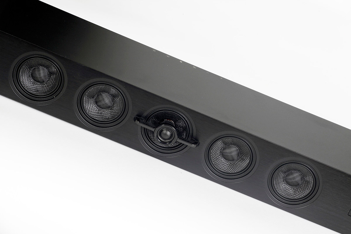 По краям лицевой панели саундбара расположены два коаксиальных излучателя, отвечающих за создание полноценного стереоэффекта во фронтальной плоскости. В центре корпуса находится еще один такой же двухполосный коаксиальный драйвер, ответственный за центральный канал. Виртуальные тыловые каналы формируются четырьмя широкополосными динамическими головками, смонтированными парами слева и справа от центрального канала. При этом вся батарея динамиков закрыта съемным защитным грилем.