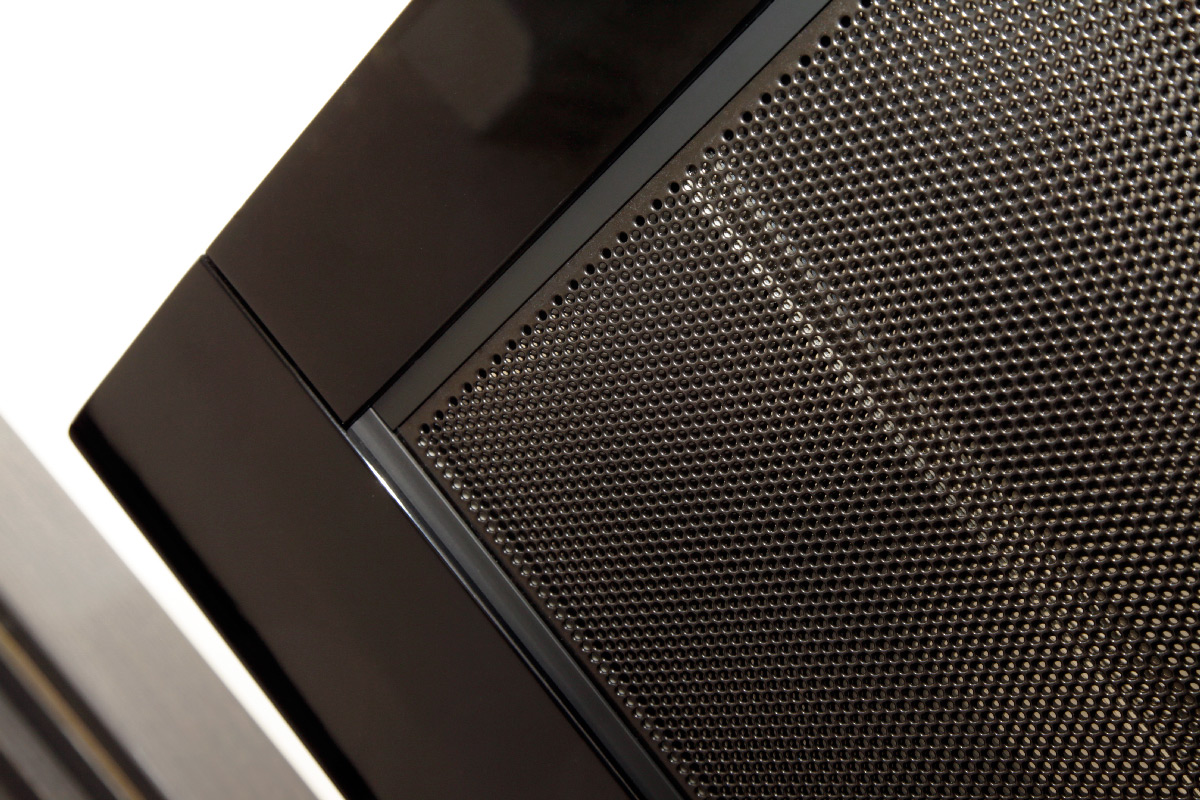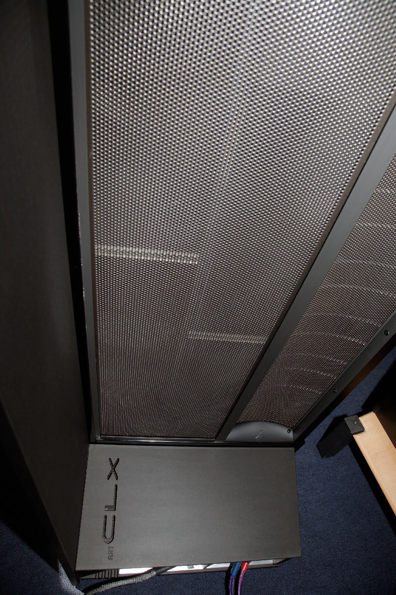 Итак, у MartinLogan CLX Art рама ArtFrame содержит два электростатических излучателя. Первый, фирменный Curvilinear LineSource (CLS) XStat – «полотно» размером 145 x 22 см. Он представляет собой выпуклый сэндвич, выполненный методом плазменной сварки в вакууме: всего слоев пять (ClearSpar – MicroPerf - Plasma BondedDiaphragm – MicroPerf – ClearSpar). Полукруглая форма обеспечивает широкую диаграмму рассеивания звука, а излучающие слои MicroPerf, в которых микроотверстий в два раза больше, чем в традиционных электростатических панелях, гарантируют высочайшую эффективность излучения. Прокладки ClearSpar обеспечивают постоянное натяжение диафрагмы. Вторая панель работает на бас, она называется DualForce и имеет размеры 144,8 x 29,2 см.