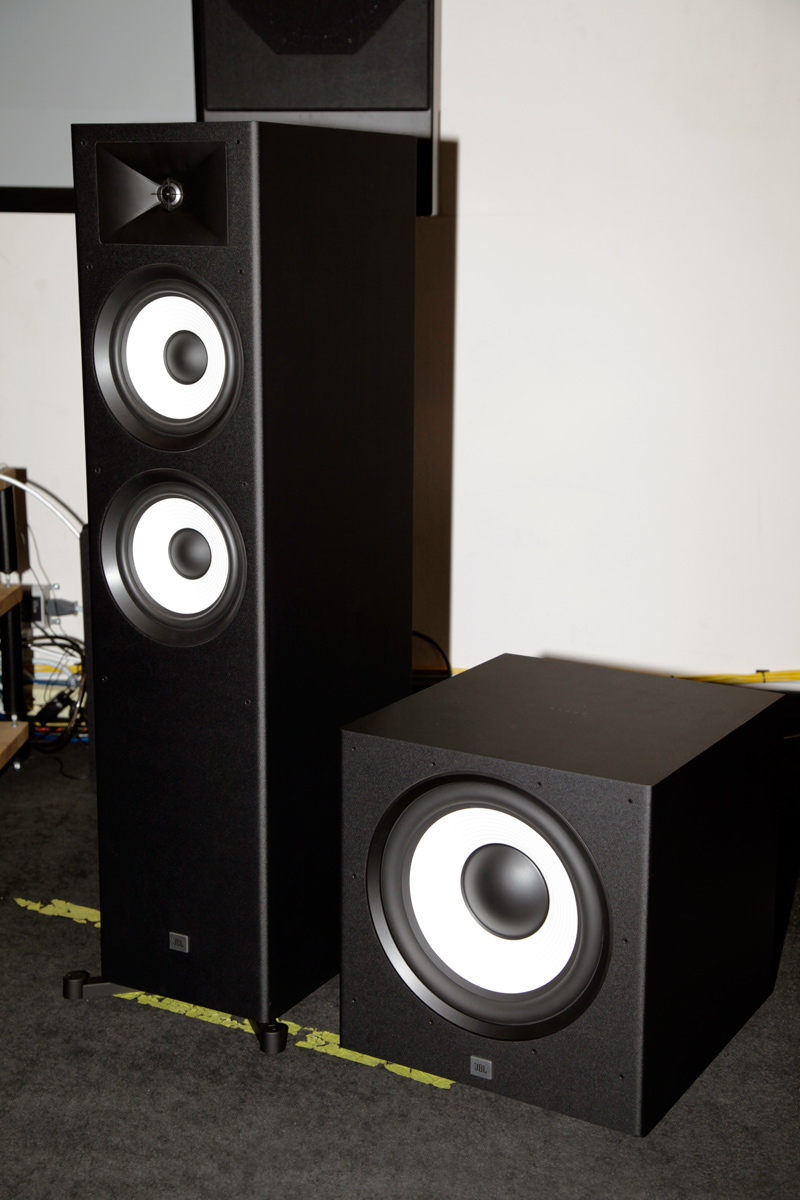 Для низкочастотной поддержки можно выбрать одну из двух моделей активных сабвуферов — с драйверами диаметром 10 или 12 дюймов. В первом случае мощность встроенного усилителя составляет 150 Ватт (в пике аппарат способен выдать до 300 Ватт), для более крупного сабвуфера выбран усилитель мощностью 250 Ватт (в пике — до 500 Ватт). В остальном эти два сабвуфера идентичны. При взгляде на старшую модель напольной акустики JBL Stage A190 могут закрасться сомнения в необходимости использовать с ними сабвуфер, и появляется желание сэкономить, перенаправив средствами AV-ресивера сигнал LFE на фронтальную пару. Однако поддаться такому искушению можно только при ограниченном бюджете, либо при дефиците места для расстановки акустики. Иначе канал LFE стоит поручить отдельной акустической системе, особенно если ее басовый потенциал пусть и не кардинально, но превосходит возможности фронтальных АС. Заметим, что 12-дюймовые драйверы в бюджетных сабвуферах встречаются не часто, и в этом отношении JBL Stage A120P — предложение практически уникальное.