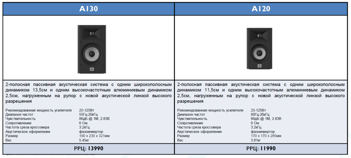 Тип – полочные акустические системы | Название – JBL Stage A130 | Частотная характеристика, Гц – 55 — 20 000 | Число полос – 2 (НЧ/СЧ – 13,5 см, диффузор из полицеллюлозы, ВЧ – 2,5 см, алюминиевый купол, нагруженный на рупор с акустической линзой, частоты среза кроссовера – 3,2 кГц) | Акустическое оформление – фазоинвертор | Сопротивление, Ом – 6 | Чувствительность, дБ – 86 (@ 1 м, 2,83 В) | Рекомендованная мощность усилителя, Вт – 20 – 125 | Габариты одной колонки, см – 19,0 x 32,1 x 23,0 | Масса одной колонки, кг – 5,45 | Цена, руб. – 13 990 (за пару)