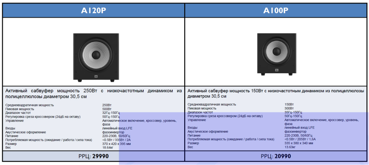 Тип – активный сабвуфер | Название – JBL Stage A120P | Выходная мощность, Вт – 250 (в пике - 500) | Частотная характеристика, Гц – 32 — 150 | Регулировка частоты среза кроссовера, Гц – 50 — 150 (24 дБ на октаву) | Динамическая головка, см – 30,5, диффузор из полицеллюлозы | Акустическое оформление – фазоинвертор | Аудиовходы – RCA (LFE) | Аудиовыходы – нет | Потребляемая мощность, Вт – 335 | Габариты, см – 42,0 x 39,5 x 37,0 | Масса, кг – 18,64 | Цена, руб. – 29 990