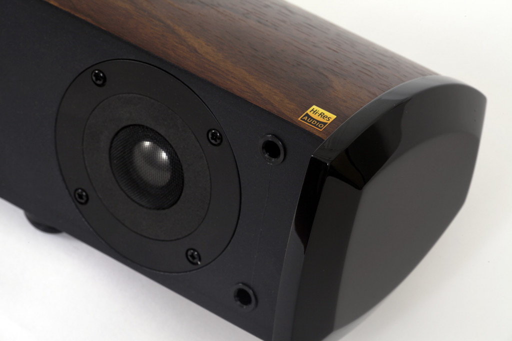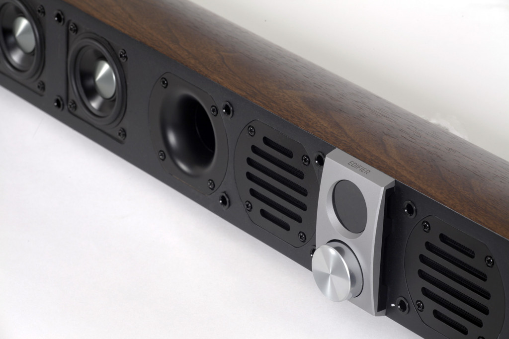 По своей сути, Edifier S50DB это стереофоническая активная акустическая система, выполненная в виде моноблока. При этом, левая и правая колонки полностью изолированы друг от друга модулем усиления, расположенным в центре корпуса. Определяющее влияние на качество звучания любой акустической системы оказывают использованные в конструкции излучатели. За высокочастотный диапазон в Edifier S50DB отвечают купольные твитеры с титановыми дюймовыми диффузорами, прикрытыми аккуратными металлическими защитными решетками. Специальная конструкция твитера обеспечивает широкую диаграмму направленности, что, в свою очередь, способствует расширению звуковой сцены и зоны комфортного прослушивания. Средние и низкие частоты в каждом канале системы отрабатываются парой длинноходных драйверов с алюминиевыми диффузорами диаметром 60 мм, работающих в фазоинверторном акустическом оформлении. Большой рабочий ход диффузоров обеспечивает достаточно низкую граничную частоту рабочего диапазона Edifier S50DB, несмотря даже на весьма скромные размеры динамиков. При проектировании этих излучателей использовался аналитический диагностический измерительный комплекс акустических резонансов Klippel. Крупные порты фазоинвертора выведены на лицевую панель, что позволяет без проблем вешать саундбар прямо на стену.