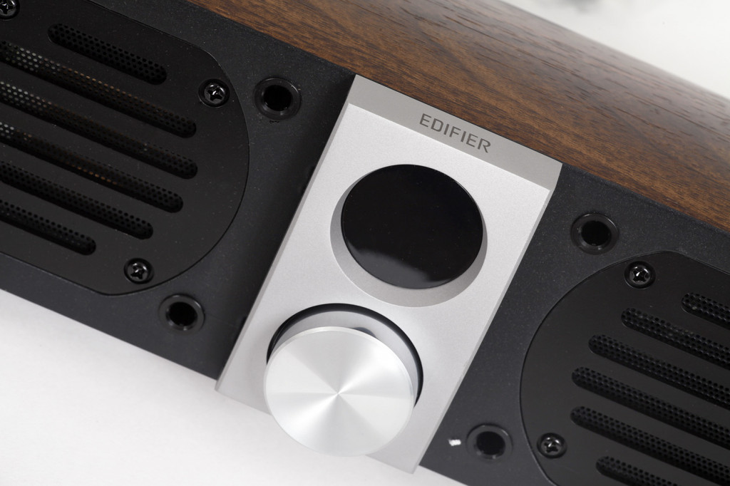 Саундбар Edifier S50DB выглядит гораздо дороже своей цены. Отделка не просто имитирует дерево - корпус саундбара выполнен из MDF, а внешнее покрытие, повторяющее фактуру темного ореха, и выглядит, и тактильно напоминает натуральное дерево - редкий случай для доступной техники. Завершающий штрих - небольшая алюминиевая панель по центру саундбара с круглым информационным дисплеем и крупной рукояткой регулировки громкости.
