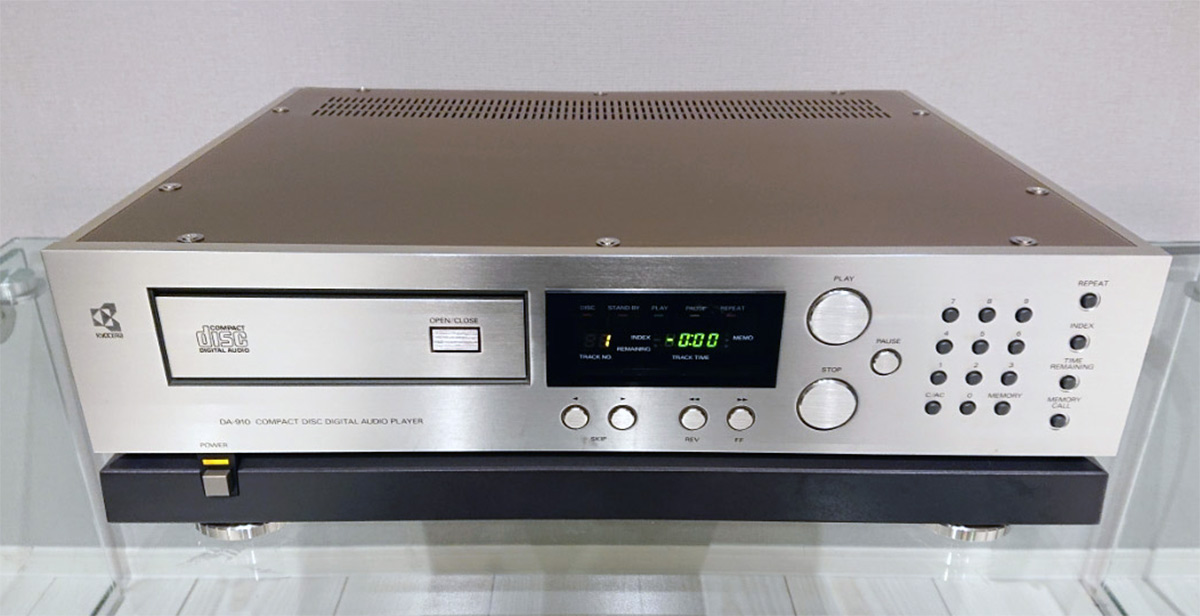 Еще одна платформа, которая с успехом использовалась не только в фирменном плеере, но и в устройствах сторонних производителей, Kyocera DA-910. Universum и Nakamichi с радостью взяли наработки «керамической» компании на вооружение; использование мощного композитного основания гарантировало отличное подавление вибраций. Качественная дискретная схемотехника, пара чипов Philips TDA1540D, высочайшее качество сборки, отличный (прозрачный и проникновенный) звук обеспечили модели настоящий успех – даже с учетом его относительно высокой цены (на старте продаж за аппарат просили 198 000 йен). Kyocera DA-910 гарантировал АЧХ от 5 до 20 000 Гц при соотношении «сигнал/шум» в 90 дБ и 0,007% искажений.