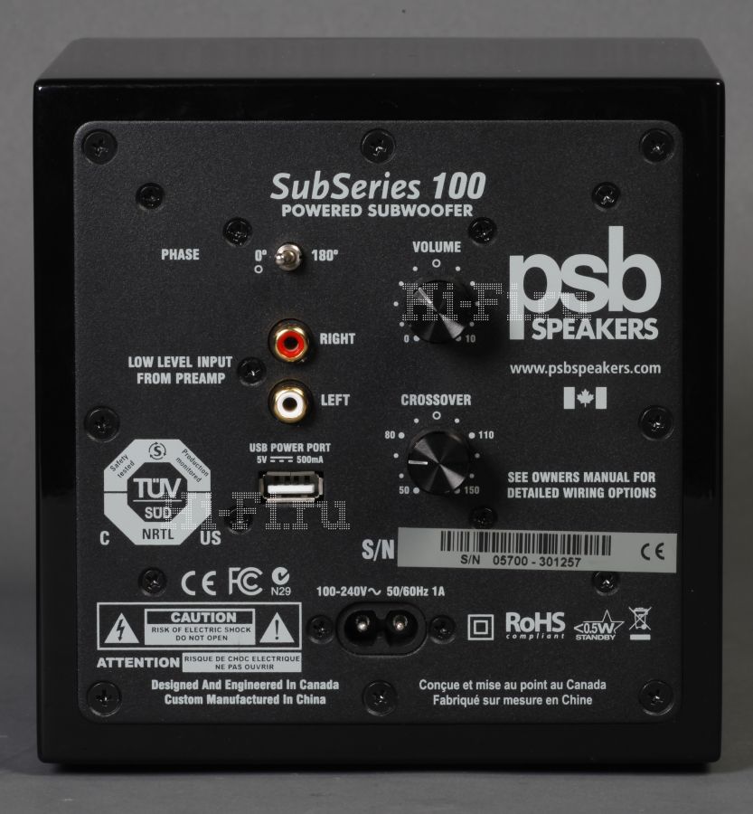 Миниатюрный сабвуфер PSB SubSeries 100 оформлен в кубическом закрытом корпусе и оборудован НЧ-динамиком диаметром 13,5 см, специально разработанным для получения максимальной отдачи низких частот при минимальных габаритах. Встроенный усилитель класса D обеспечивает постоянную мощность 50 Вт с пиками до 100 Вт. Блок питания встроенный, кабель используется стандартный, присутствуют регуляторы уровня, частоты среза и переключатель фазы. Низкоуровневый вход выполнен на двух разъемах RCA. Здесь тоже есть порт USB, и тоже предназначенный лишь для питания портативной техники. Конструкция корпуса добротна и массивна, что исключает внутренние резонансы. Супермощного баса при таких габаритах едва ли стоит ожидать, но для компактных сателлитов этого и не требуется. Система в целом должна звучать гармонично, ибо значительный перевес в любой частотной области — безусловный недостаток.