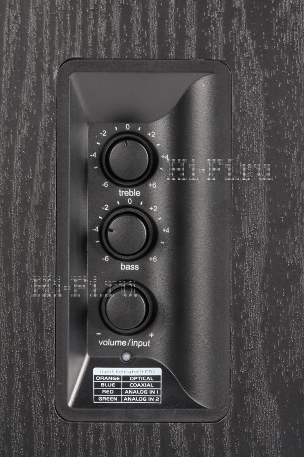 Органы управления разделены между боковой панелью правой колонки и пультом ДУ. На корпусе АС имеются регулировки тембров и громкости, а также индикатор выбранного источника, который выполнен в виде меняющего цвет светодиода. Пульт, помимо клавиш регулировки громкости, предоставляет возможность выбрать источник (при помощи тех же клавиш). Вместо традиционного для бюджетной техники потенциометра для регулировки уровня усиления применяется валкодер, как в хороших предусилителях.