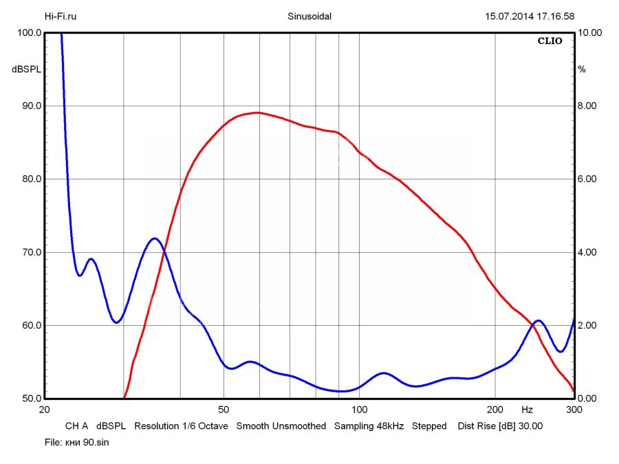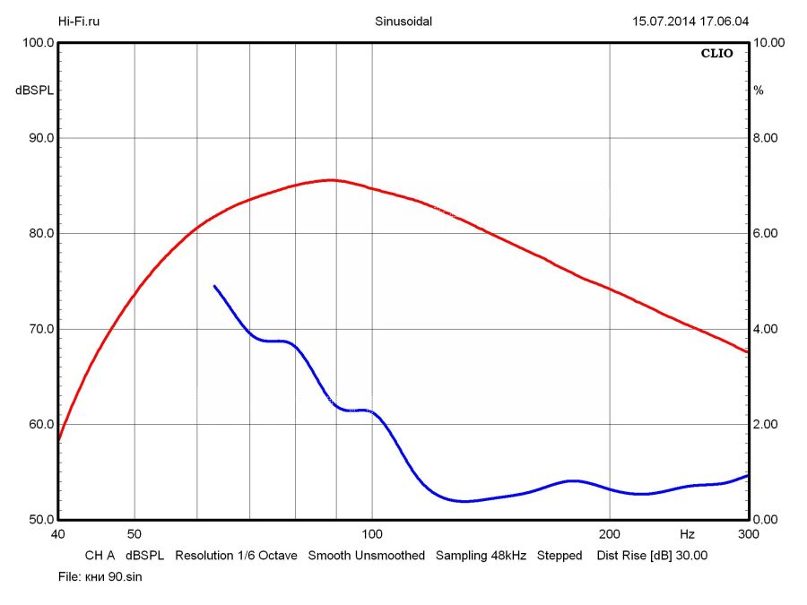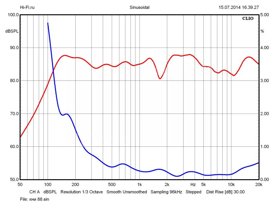 График амплитудно-частотной характеристики мониторов Edifier R2700 радует крайне малой неравномерностью в области средних частот. Здесь флуктуации легко укладываются в коридор 2 дБ (рис. 1). В верхней части диапазона показатель хуже. Единственная причина этого — провал чувствительности в зоне раздела полос, обусловленный взаимной работой в этой части спектра СЧ-драйвера и твитера. Подобного рода недочет устраняется правильным позиционированием АС относительно слушателя, а положительный дисбаланс в ВЧ-диапазоне можно откорректировать при помощи встроенного темброблока. Возможности его достаточно широкие. В области НЧ коррекция осуществляется в пределах +7,8…–6,7 дБ (80 Гц), в ВЧ-регистре ±5,7 дБ (10 кГц) (рис. 2). Нижняя граничная частота, рассчитанная от средней величины чувствительности по уровню –10 дБ, имеет низкое значение 38 Гц, но здесь мы вынуждены добавить ложку дегтя: рост нелинейных искажений весьма ощутим на частотах ниже 60 Гц (рис. 3), и нижнюю границу качественного звуковоспроизведения следует определять с этой отметки.