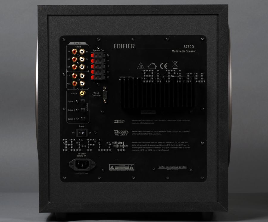 Тип – комплект акустических систем окружающего звучания | Название – Edifier S760D | Частотная характеристика, Гц – 35 - 20 000 | Число полос сателлитов – 2 (СЧ 9,2 см, ВЧ 2,5 см) | Мощность сателлитов, Вт - 60 x 5 | Тип сабвуфера - активный | Акустическое оформление сабвуфера - закрытый корпус с двумя пассивными излучателями | Диаметр басового динамика, см - 26 | Мощность сабвуфера, Вт - 240 | Габариты сабвуфера, см - 34,8 x 40 x 48,9 | Габариты сателлитов, см – 11,6 x 20,2 x 16 (фронт и тыл), 31,6 х 11,7 х 15,7 (центр) | Масса, кг – 19 (сабвуфер), 11,5 (все сателлиты)