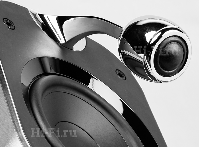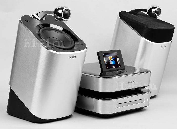 Возвращаясь к дисплею, отметим, что на него можно вывести меню системы, просматривать фотографии и обложки проигрываемых альбомов. Система оборудована скалером, масштабирующим изображение с дисков DVD до привычного разрешения 1080p. Интерфейс HDMI тоже к вашим услугам. За усиление отвечает двухканальный усилитель класса D, развивающий до 50 Вт в каждом канале. Реализованная здесь инновационная технология Philips FullSound вкупе с мощным звуковым цифровым процессором (DSP) способствует тому, что звучание «консервированных» файлов доводится до уровня стандартного CD без каких-либо искажений. Однако гвоздь программы, а вернее, системы Philips MCD900 — это роскошные сателлиты SoundSphere особой фирменной конструкции. Они облачены в мощные корпуса из алюминия, СЧ/НЧ-динамик (5 дюймов) направлен почти вверх, а над ним на изящной хромированной лапе, подобно микрофону, завис полуторадюймовый твитер. Такая схема призвана обеспечить очень насыщенный и глубокий саунд с отменным басом, а высокочастотная головка способна распространять чистейший сигнал в любом направлении.