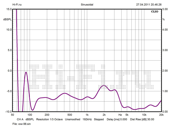 Характеристики аудиотракта головного устройства Philips MCD900 выглядят достаточно скромно. Полоса пропускания сигнала ограничена 21 кГц по уровню –3 дБ (рис.2). Регулировка тембра осуществляется несимметрично (–7…+11 дБ для НЧ, –6…+7 дБ для ВЧ). Отношение сигнал/шум составляет 90 дБА. Максимальная выходная мощность цифрового усилителя не превышает 50 Вт. Выходное сопротивление увеличивается с ростом частоты сигнала. Коэффициент демпфирования для нагрузки 8 Ом на частоте 80 Гц равен 50 ед. Комплектная акустика не предъявляет особых требований к усилителю. Среднее значение модуля импеданса — 10 Ом, а минимум не опускается менее 6,5 Ом. Нижняя граничная частота при спаде –10 дБ составляет 49 Гц. Среднее значение нелинейных искажений при звуковом давлении 88 дБ на 1 м равняется 0,63% (рис.3). Поведение АЧХ очень стабильно. Неравномерность характеристики в полосе средних частот не превышает +/-1,5 дБ.