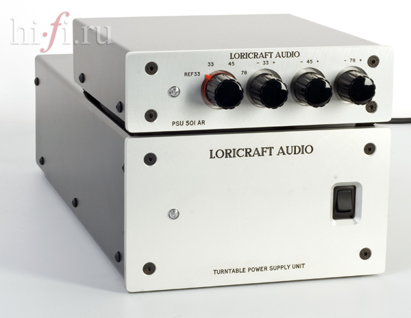 Блок питания состоит из двух секций — большого ящика с трансформаторами, из которого ток напряжением 130 В поступает на двигатель, и компактного модуля переключения скоростей, где можно не только выбрать между 33, 45 и 78 оборотами в минуту, но и плавно подстраивать скорость вращения при использовании стробоскопа.