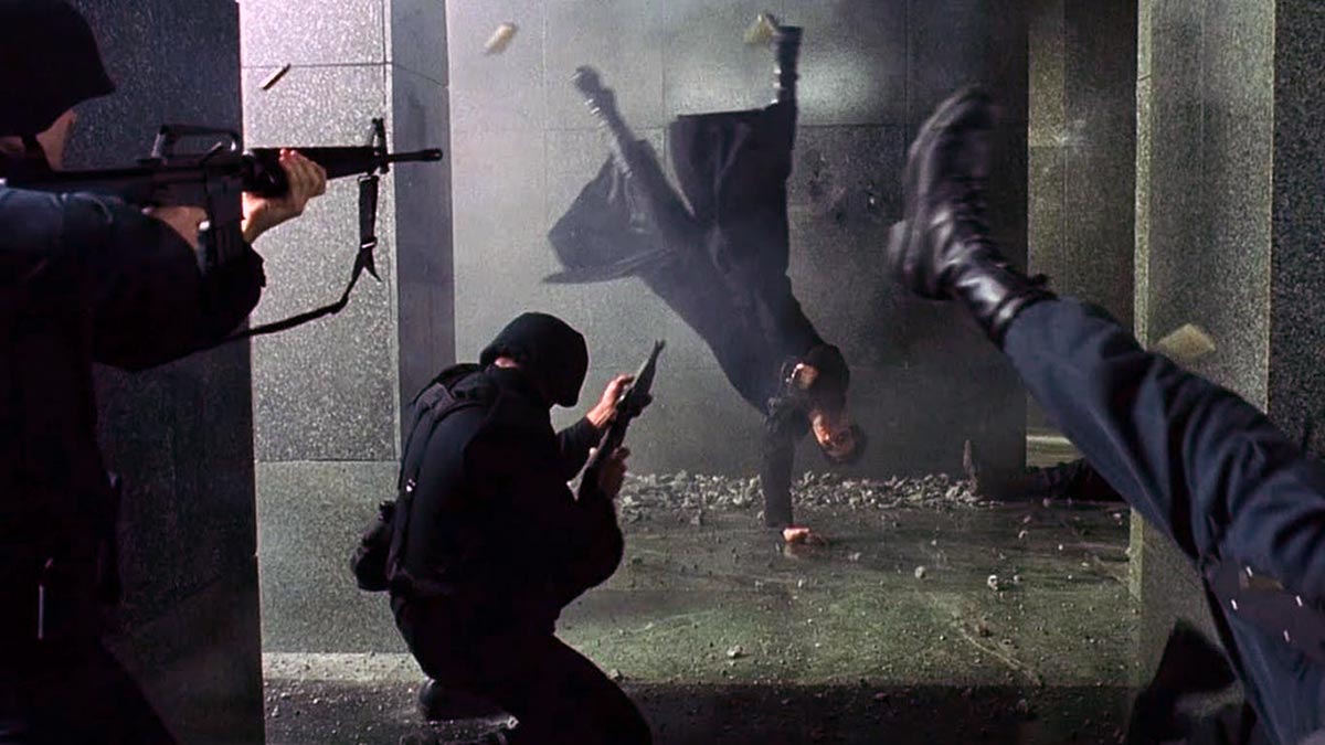 Первые пространственные эффекты в кино использовали уже известную во времена фотографирования особенность фотопленки. Её можно было экспонировать больше, чем один раз. То есть на один кадр можно делать несколько фото сразу, но все изображения на фото, если они случаются в кадре, будут полупрозрачными. Именно это можно увидеть в кадре, где агент избегает пуль Нео — все его изображения полупрозрачные и удивительно напоминают эксперименты с так называемой хронофотографией, которые проводил Этьен-Жюль Маре еще в XIX веке.