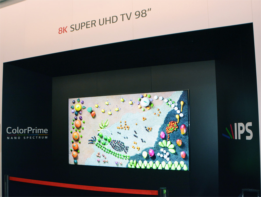 Обычные посетители выставки этих чудес не видели. Зато помимо серийных моделей OLED-телевизоров могли оценить, чего достигла компания на ниве производства привычных ЖК-мониторов на панелях IPS. К примеру, LG продемонстрировала 98-дюймовый прототип телевизора с разрешением 8К, а именно 7680 х 4320 пикселей, что в четыре раза больше, чем 4К.