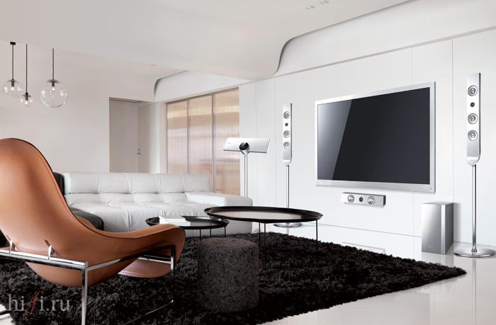 Четыре его напольных спикера озвучивают фронтальные и боковые каналы эффектов, а компактные сателлиты с беспроводной системой получения сигнала берут на себя функцию тыловых. Несколько слов о беспроводной передаче: от центрального блока волны долетают до приемника-усилителя (на первой фотографии он справа от сабвуфера), к которому колонки подключаются уже проводами. То есть, владелец может избежать прокладки кабелей по комнате для этой пары АС, но сетевую розетку приготовить все-таки придется. Стильный центральный блок с сенсорным управлением можно размещать на подставке или повесить на стену.
