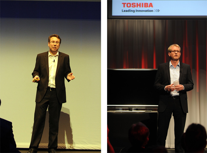 В официальной части мероприятия, вице-президент Toshiba Europe Тошихиро Икеда (Toshihiro Ikeda) рассказал присутствующим журналистам о той помощи, которую оказывает компания пострадавшим соотечественникам, от обрушившийся на их страну трагедии, а так же обратил внимание на основные направления развития компании. Затем о новинках этого года поведали более подробно европейский директор по маркетингу Саша Ланге (Sascha Lange; на фото слева) и генеральный менеджер Toshiba Europe Томас Текентруп (Thomas Teckentrup).