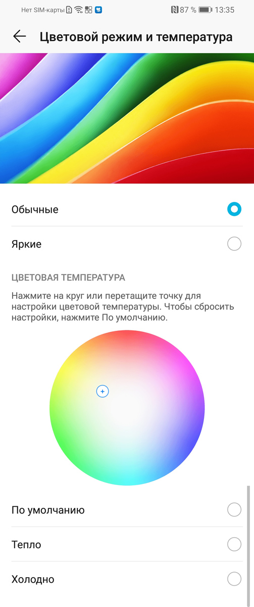 В модели HONOR 20 LITE установлен ЖК-экран диагональю 6,15 дюйма с разрешением 2 312 х 1 080 пикселей, соответственно, плотность изображения составляет 415 пикселей на дюйм. Это первое отличие от стандартной версии 20-ки, где используется дисплей чуть большего размера – 6,26 дюйма с тем же разрешением и матрицей LTPS. Хотя производитель не указывает тип матрицы, установленной в HONOR 20 LITE, можно предположить, что здесь стоит иная разновидность чуть ниже классом. Правда, в реальной эксплуатации предъявить претензий к углам обзора или яркости невозможно. Установленная по умолчанию цветопередача далека от правильной, но так поступают все производители, стремясь сделать экран максимально ярким и броским. При аккуратной настройке цветовой температуры, которой способствует традиционно присутствующая в смартфонах от HONOR возможность выбрать нужное вам значение одним нажатием пальца на круговую палитру, экран проявляет себя с самой лучшей стороны. Так что если для вас важно соответствие того, что вы снимаете в реальности и видите на экране телефона, то HONOR 20 LITE поможет вам этого добиться.