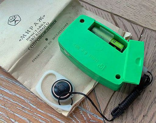 Беспроводные наушники родом из 1975 года! Назывались они «Приставка звукового сопровождения» и были предназначены для беспроводного прослушивания бытовой аппаратуры в пределах комнаты. В самой приставке был установлен высокочувствительный усилитель, на входе которого включена низкочастотная катушка, выполняющая роль магнитной антенны. При этом выход магнитофона, электрофона, телевизора или приёмника нагружался на замкнутую петлю провода, растянутого на полу или на стене комнаты. В петле образуется переменное электромагнитное поле, которое и принимает приставка.