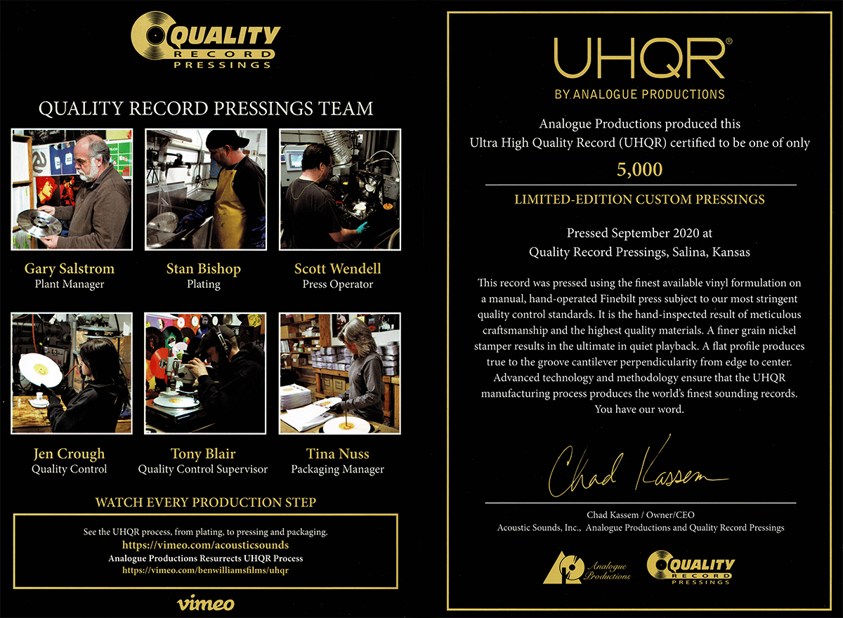 Ремастеринг выполнен Крисом Беллманом (Chris Bellman) на полностью аналоговом тракте с аналоговых мастер-лент на студии Bernie Grundman Mastering, печать сделана на ручных формах Finebilt с обязательной визуальной проверкой каждого диска перед упаковкой – в итоге перед нами оказались одни из наиболее качественно сделанных пластинок современности. Лейбл Analogue Productions вложил немало сил и средств в этот релиз, он вышел с задержкой почти в два года – но, результат поражает. Как с визуальной точки зрения, так и по части саунда.
