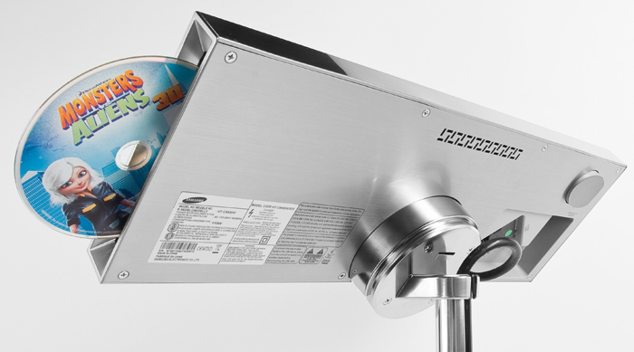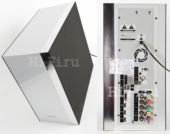 Существует несколько вариантов установки этого блока — его можно повесить на стену рядом с телевизором, поставить на стол или стойку для аппаратуры или держать на полу, для чего к аппаратуре прилагается специальная металлическая штанга на массивном основании. Для подключения устройства к сабвуферу, в корпусе которого сконцентрирована вся электроника комплекта, используется специальный системный кабель. Конечно, было бы удобнее, чтобы головной модуль общался с сабвуфером по беспроводному каналу, однако если подобная передача многоканального звука не представляет технических проблем, то для видео высокого разрешения с дисков Blu-ray и 3D Blu-ray пропускной способности имеющихся протоколов беспроводной связи уже не хватит. Поэтому при инсталляции Samsung HT-C9950W, чтобы не нарушить бескомпромиссный дизайн системы, нужно продумать меры по маскировке весьма толстого кабеля, окрашенного к тому же в черный цвет. Кроме того, придется уделить внимание поиску подходящего места для сабвуфера, поскольку выход HDMI для соединения с телевизором расположен именно на коммутационной панели низкочастотного модуля. Там же есть и два цифровых входа HDMI для подключения игровой приставки или внешнего мультимедийного проигрывателя. То есть убрать сабвуфер с глаз долой в дальний угол, скорее всего, не удастся.