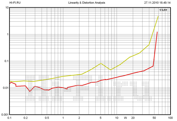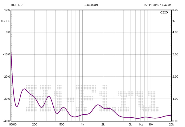 График амплитудно-частотной характеристики комплектных акустических систем выявляет завидно низкую неравномерность во всем рабочем диапазоне частот (рис. 1). Так, для фронтальных и тыловых пар в СЧ-области она не превышает +/-1,2 дБ, и на ВЧ данный показатель не претерпевает серьезного ухудшения. Ширина полосы пропускания этих колонок полностью охватывает весь СЧ/ВЧ-диапазон. На низких частотах вся нагрузка полностью ложится на сабвуфер. Он воспроизводит бас начиная с 39 Гц (по уровню –10 дБ). Несмотря на компактные размеры, сателлиты способны работать в широком диапазоне выходных громкостей без заметных искажений. На графике представлено изменение КНИ при уровне выходного сигнала в 82 дБ SPL (рис. 2). Среднее значение в полосе 200 Гц — 10 кГц составило 0,44%. Усилители комплекта обеспечивают на выходе до 54 Вт неискаженной мощности на каждом канале. Отношение сигнал/шум в аналоговом режиме равно 87 дБА.