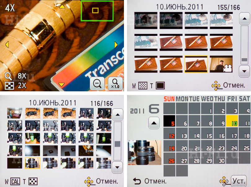 Посмотреть снимок можно в том числе в увеличенном режиме (левый верхний скриншот), в виде 12 или 30 миниатюр, а также в привязке к календарю. Названия дней почему-то не переведены на русский язык.