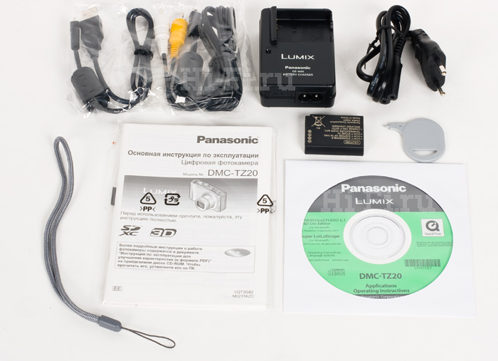 Для камер марки Panasonic набор прилагаемых аксессуаров вполне стандартный: ремешок для запястья, батарея с зарядным устройством, кабели USB и AV (для вывода сигнала в аналоговом виде; цифровой HDMI придется докупить отдельно), полную бумажную инструкцию, компакт-диск с сопутствующим программным обеспечением и необычный стилус, позволяющий пользоваться сенсорным интерфейсом даже тогда, когда на руки надеты перчатки или варежки.