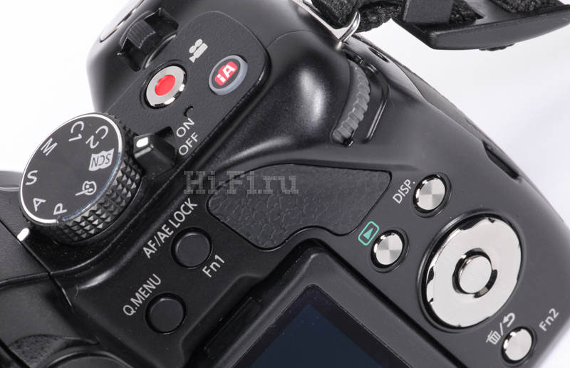 Стереофонический микрофон расположен удачно: на самом верху. Случайно прикрыть его пальцем едва ли получится. За микрофоном находится стандартный горячий башмак. При установке внешней вспышки микрофон также не будет перекрыт. Электронный видоискатель имеет диоптрийную подстройку и датчик приближения. Есть также кнопка принудительного переключения между экраном и видоискателем.