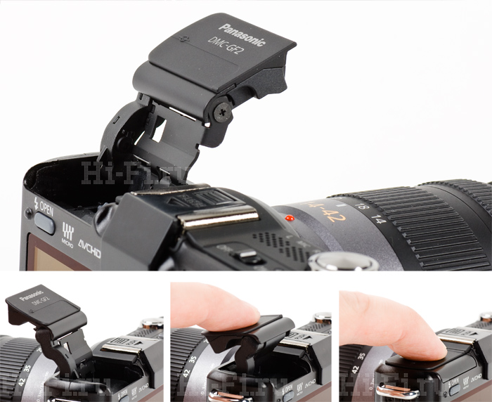 Очень добротный корпус GF2 изготовлен из металла, пластиковыми сделаны лишь крышки отсеков и козырек подъемной вспышки. Наличие последней – большое достижение конструкторов, поскольку у аппаратов такого класса встроенной вспышки нет вовсе. Если же вспышка имеется, то корпус обычно получается более крупным. Недаром специалисты Panasonic называют GF2 самой компактной моделью в своем классе, оснащенной вспышкой. Конструкция вспышки оригинальная: в припаркованном состоянии она сложена, а при нажатии на кнопку выстреливает под действием пружины, поднимаясь довольно высоко – рукой заслонить не получится.