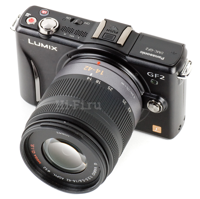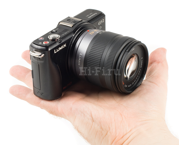 На российский рынок Panasonic Lumix DMC-GF2 поставляется в двух вариантах комплектации: GF2K (24 990 руб.) – со стандартным зум-объективом 14—42 мм (28—84 мм в пленочном эквиваленте), оснащенным оптическим стабилизатором, и GF2C (27 990 руб.) – с «блинчиком-фиксом» 14 мм, светосильным, без стабилизатора.