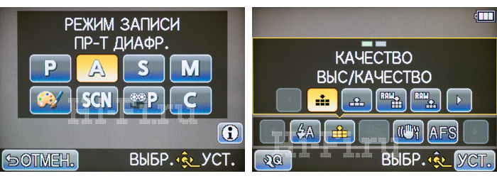 Выбор режимов съемки (слева). Список избранных настроек (справа), в любой момент его можно отредактировать.