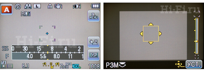 Главный экран во время съемки в режиме приоритета диафрагмы (слева). Выбор точки автофокуса (справа). Размер участка фокусировки можно менять. Если активировать соответствующую функцию, то фокусировка на выбранном участке и съемка будут происходить сразу после касания дисплея.